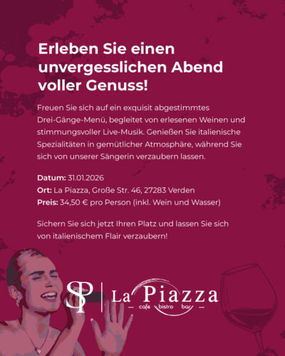 Verpassen Sie weder eine La Piazza Veranstaltung, ein La Piazza Event, noch einen Termin, um es sich bei uns kulinarisch gut gehen zu lassen. Schauen Sie gerne immer wieder vorbei. Wir halten Sie auf dem Laufenden. Und auch bei Facebook können Sie uns gerne folgen, um stets auf dem Laufenden zu sein.
